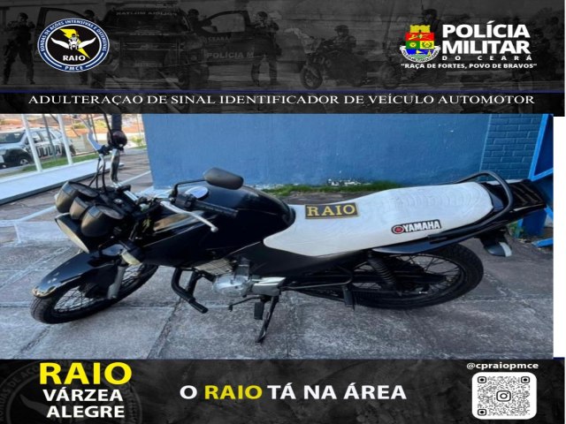 Um homem foi preso, no bairro Varjota, em Várzea Alegre, pelo Policiamento de Rondas de Ações Intensivas e Ostensivas, neste domingo, 31 de agosto, por adulteração de sinal identificador de uma motocicleta da marca Yamaha, cor preta, placa NQY 2833.